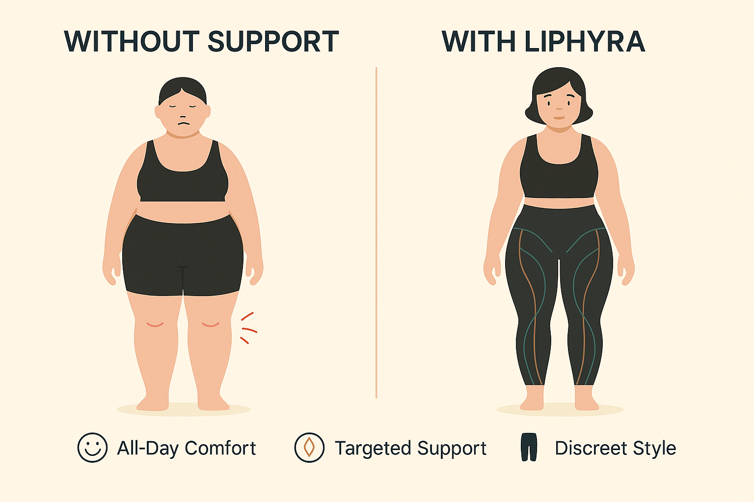 I can’t believe I spent so many years thinking something was wrong with me. Once I understood it was lipedema and found LIPHYRA™, everything changed. These don’t look medical at all — they just look like normal leggings. But the relief they provide is incredible.